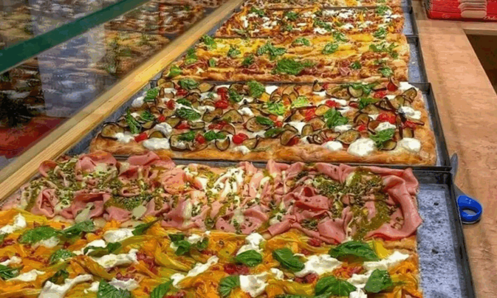 - Pizza al taglio (піца на вагу): прямокутний формат, який продається на шматки, ідеально підходить для швидкого перекусу.