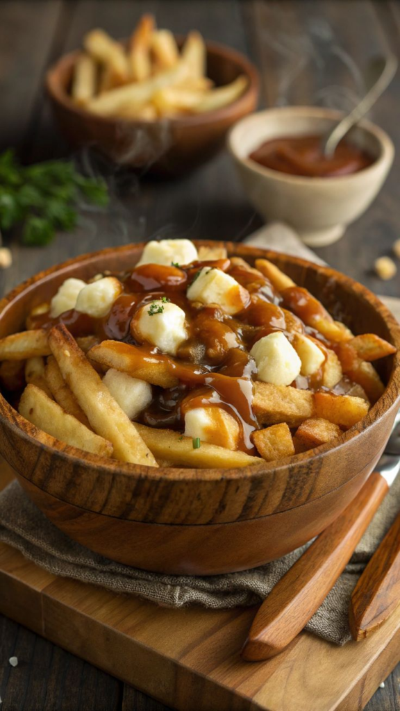 - Путін (Poutine, Канада): картопля фрі з молодим сиром та густим м’ясним соусом «грейві».